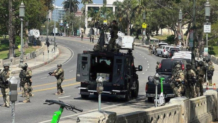 Este lunes, cerca de 90 miembros de la Guardia Nacional de California, junto a más de una docena de vehículos militares —incluidos 17 Humvees, cuatro unidades tácticas, dos ambulancias y soldados armados—, participaron en el resguardo de los agentes de inmigración durante la redada en el parque MacArthur.